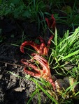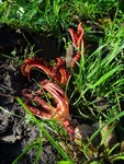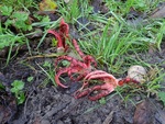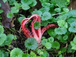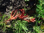 Vruchtlichaam vanuit een zich ondergronds ontwikkelend, wittig, leerachtig duivelsei, Ø 2-4 cm, met de uiteinden van de armen aan elkaar tevoorschijn komend. De 4-6 armen staan op een 2-5 cm lange steel en spreiden zich inktvisachtig en naar beneden omgebogen uit. Armen 4-7 cm lang, breekbaar, diep rood, met op de netvormig gegroefde bovenzijde olijfgroen, stinkend slijm.